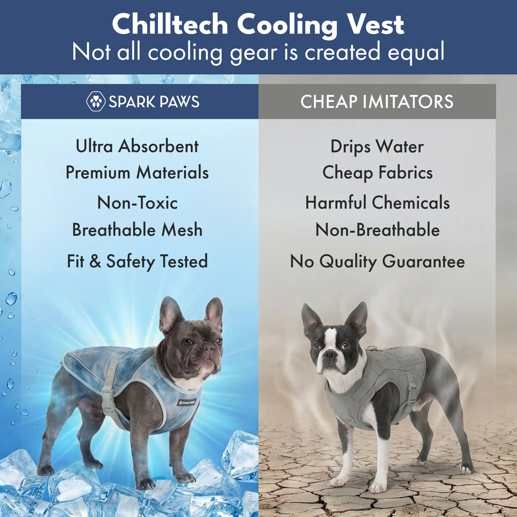 Die Chilltech Kühlweste ist ein unverzichtbares Zubehör für Hunde, die im Sommer leicht überhitzen. Die Kühlweste reduziert die Körpertemperatur Ihres Hundes durch Verdunstung - Sie müssen sie nur mit Wasser tränken, auswringen und Ihrem Hund anziehen. Der Stoff ist speziell so konzipiert, dass er Wasser zurückhält, was einen kühlenden Effekt bewirkt. Die Mesh-Schichten lassen die Luft zirkulieren, während sie das Sonnenlicht ablenken und zusätzlichen UV-Schutz und Schatten bieten.